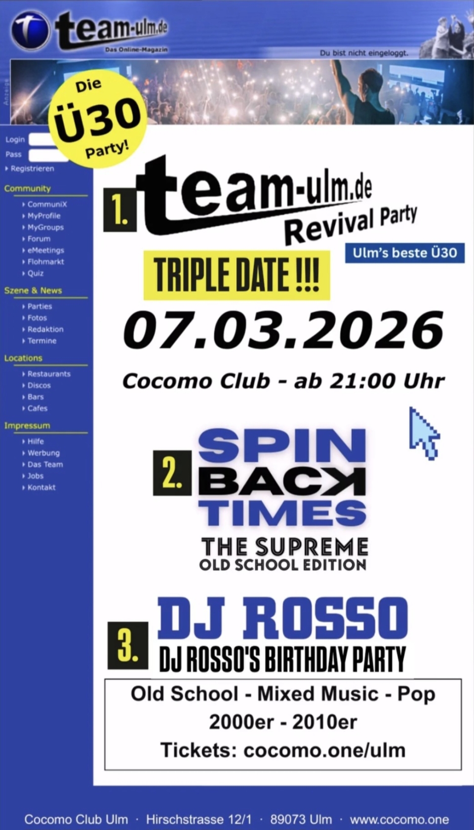 | * * * * * * * * * * * * THE NEXT DATES * * * * * * * * * * * * | * * THE TRIPLE TEAM ULM SUPREME OLDSCHOOL * * Weitere Informationen findet Ihr hier unter dem roten Button - NEXT PARTY - |